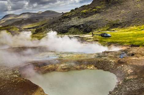 When we fly over one of the most active volcanic areas in Iceland, the Hellisheiði plateau, you’ll see moss covered lava fields stretched out to the horizon, interspersed with colorful basalt mountains, steaming hot springs and the very geothermal power plants that supply Reykjavik it's renewable energy. On this sightseeing tour, we make sure to land off the beaten track and away from the crowds to witness the regions raw energy first-hand. In the landing place of Hengill geothermal area - named after the Hengill volcano - you can witness upfront the untouched Icelandic nature. We bring you close to hot springs and boiling mud pots, and you might even see some sheep wandering around the valley in the summer. Note that this is not a regular tourist site, there are no safety ropes etc. - it is just how nature created it. Furthermore, no matter the season or time of year, this area always brings magical, colorful and beautiful views. On our way back we make a scenic pass over Reykjavik, to give you a unique aerial view of Iceland's capital.