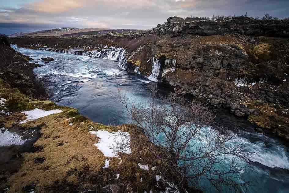 As we head back towards Reykjavík, we will make a few stops along the way notably at the waterfalls of Hraunfossar and Barnafossar. These unique waterfalls seep through the sidewalls of an arrested lava field. A subterranean water system flows underneath the over 1000-year-old old lava field and makes its way towards the Hvítá River in a picturesque environment worthy of many photos.