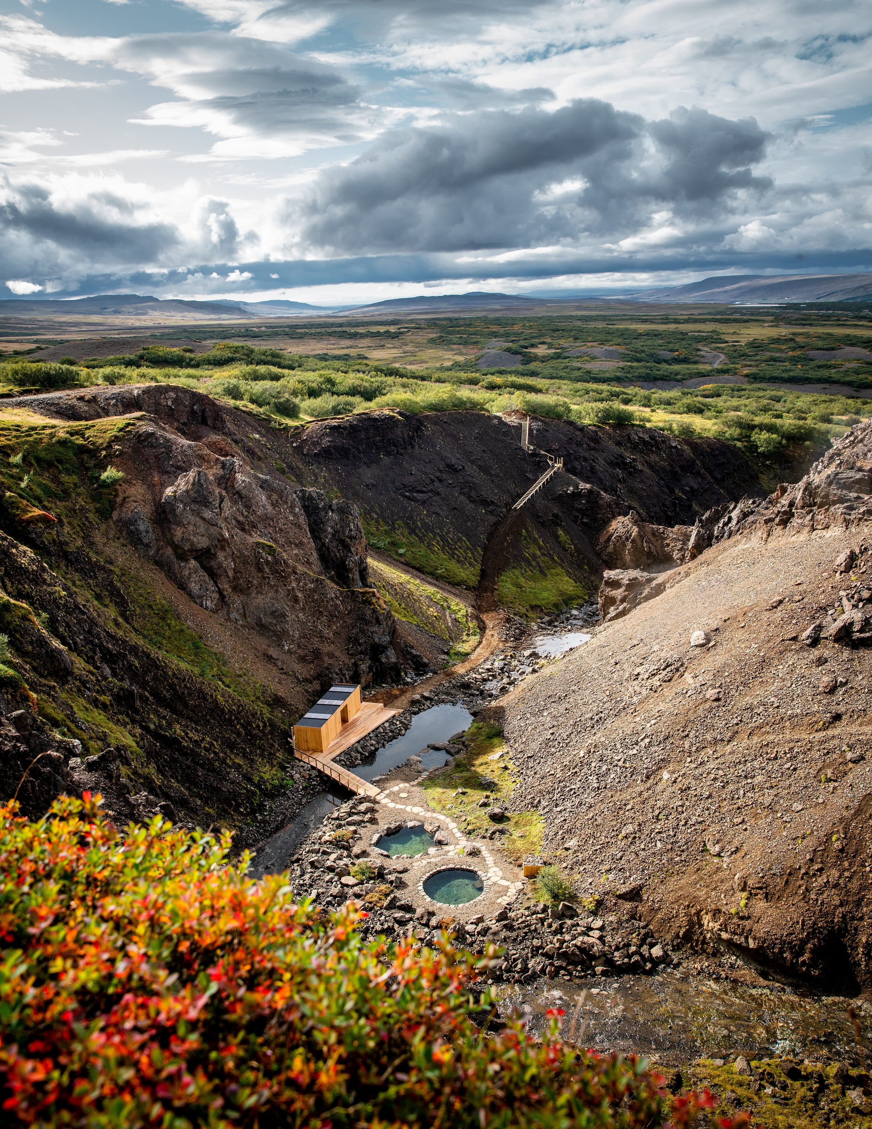 Constructed from locally sourced, natural materials like flagstone from the canyon floor, the baths are hot-spring fed pools designed to blend into the environment seamlessly using the age-old methods that created Snorralaug, a heritage site pool dating back to the 10th century. The on-site bathhouse is made from salvaged timbers from the area. Even the hooks in the changing room are repurposed horseshoes from a nearby family farm.