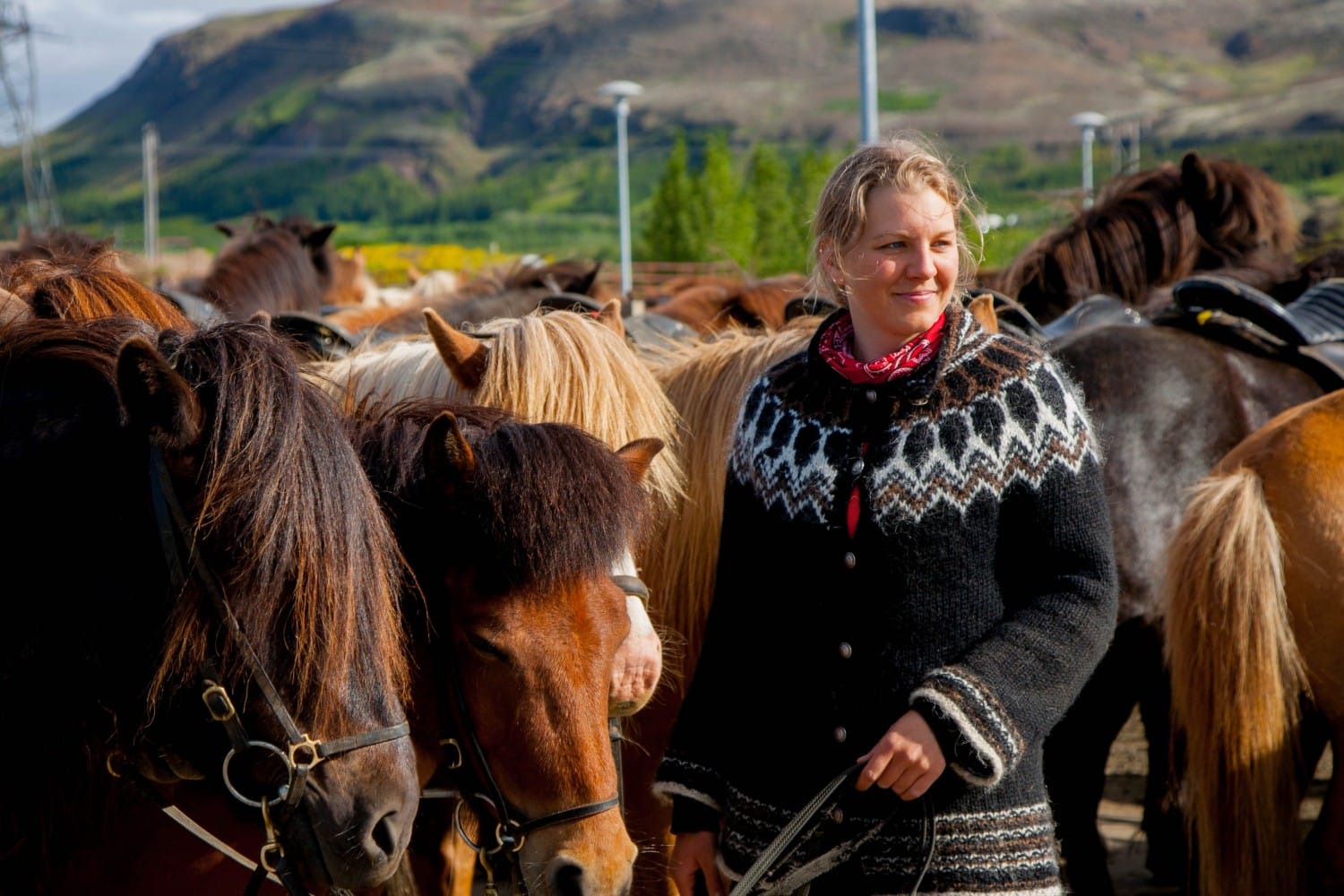Enjoy an active day in great environment! The program starts at our farm Vellir with a riding tour through the amazing Icelandic nature. We ride for 1.5 to 2 hours along meadows and lava fields in the charming countryside, followed by a light lunch at Hótel Eldhestar. After lunch we drive about 5 minutes to the green hills on foot of the volcano Hengill, just above the village Hveragerði, where we start hiking up into the magnificent geothermal valley of Reykjadalur. On our way we will see the beautiful waterfall Djúpagilsfoss and many hot springs. We also have the opportunity to take a relaxing bath in a warm river, an unforgettable experience! On our way down, we can enjoy a spectacular panorama over volcanic mountains, the picturesque village Hveragerði and all the way down to the coastline, where we might even see the Westman Islands, weather permitting. The tour ends with coffee and cake at Eldhestar riding center.