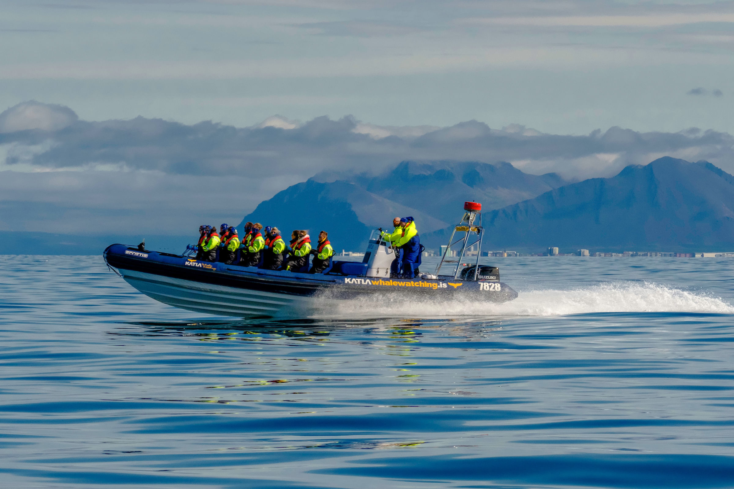 To make the 1 1/2+ hour trip as comfortable as possible, you will get a warm waterproof overall (dry suit), life jacket, googles and your own Katla Whale Watching buff/scarf.